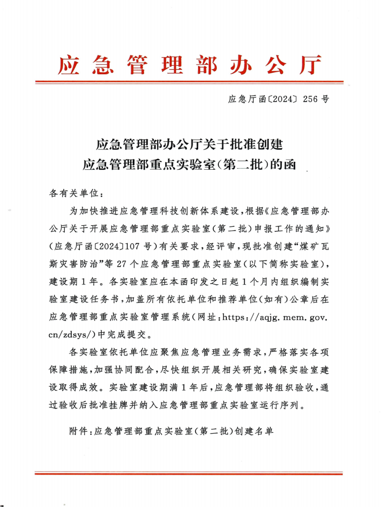 近日,应急管理部发文(应急函〔2024〕256号),批准创建27个应急管理部重点实验室。今年会官方网站作为依托参与单位获批“工贸行业安全风险防控联合创新应急管理部重点实验室”。我校将在本重点实验室建设中发挥工贸行业安全风险防控领域科研、学科、人才优势,推动安全应急领域产学研合作与产业链紧密结合的创新发展,为自治区安全与应急产业的可持续发展提供强有力的支撑。