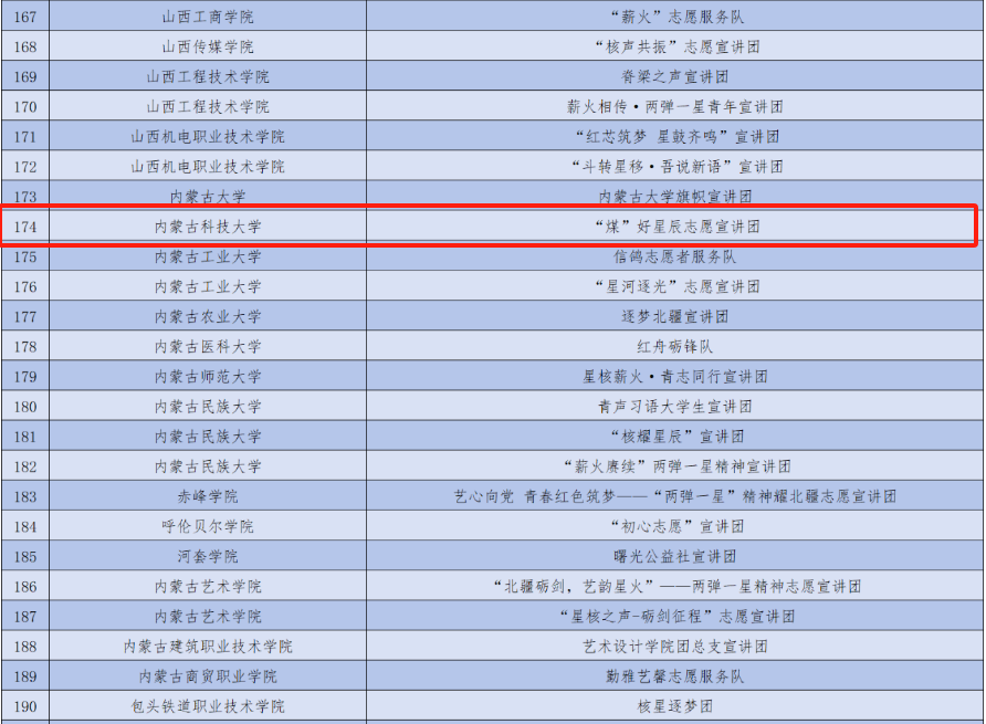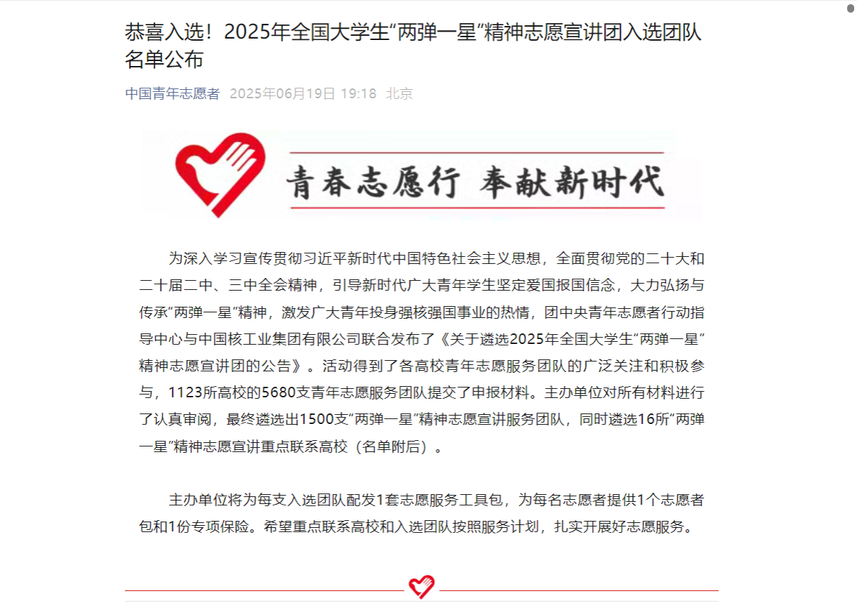 为深入学习宣传贯彻习近平新时代中国特色社会主义思想,全面贯彻党的二十大和二十届二中、三中全会精神,引导新时代广大青年学生坚定爱国报国信念,大力弘扬与传承“两弹一星”精神,激发广大青年投身强核强国事业的热情,团中央青年志愿者行动指导中心与中国核工业集团有限公司联合发布了《关于遴选2025年全国大学生“两弹一星”精神志愿宣讲团的公告》。活动得到了各高校青年志愿服务团队的广泛关注和积极参与,1123所高校的5680支青年志愿服务团队提交了申报材料。主办单位对所有材料进行了认真审阅,最终遴选出1500支“两弹一星”精神志愿宣讲服务团队,同时遴选16所“两弹一星”精神志愿宣讲重点联系高校。我校jinnianhui今年会“煤”好星辰志愿宣讲团成功入选。