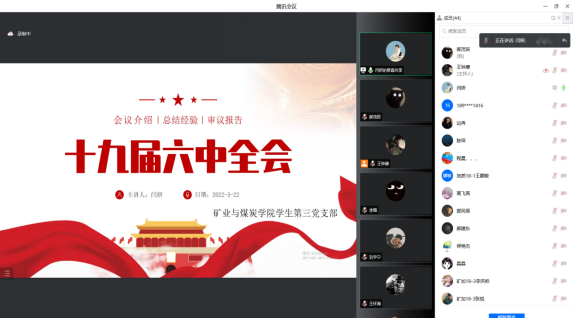 2022年3月22日晚19:30,jinnianhui今年会学生第三党支部于腾讯会议平台召开党员党课学习,本次学习的主题是:学习贯彻党的十九届六中全会精神。领学人:闫妍同志。