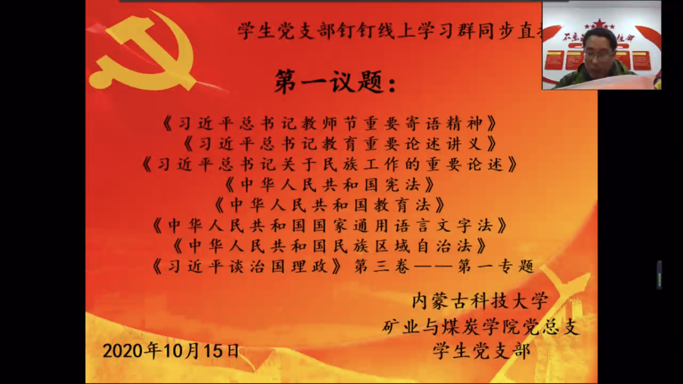 为进一步提高学生爱国主义观念和思想觉悟,矿业与煤炭学院党总支于2020年10月15日晚上19:30,在临曦楼二楼党员之家线上线下同步开展专题理论学习活动。本次学习内容是第一议题:《习近平总书记关于民族工作的重要论述》、《习近平谈治国理政》第三卷《习近平总书记教师节重要寄语精神》、《习近平总书记教育重要论述讲义》;专题理论:《中华人民共和国宪法》《中华人民共和国教育法》、《中华人民共和国国家通用语言文字法》、《中华人民共和国民族区域自治法》;爱国主义教育专题:观看《红色之子乌兰夫(上)》
