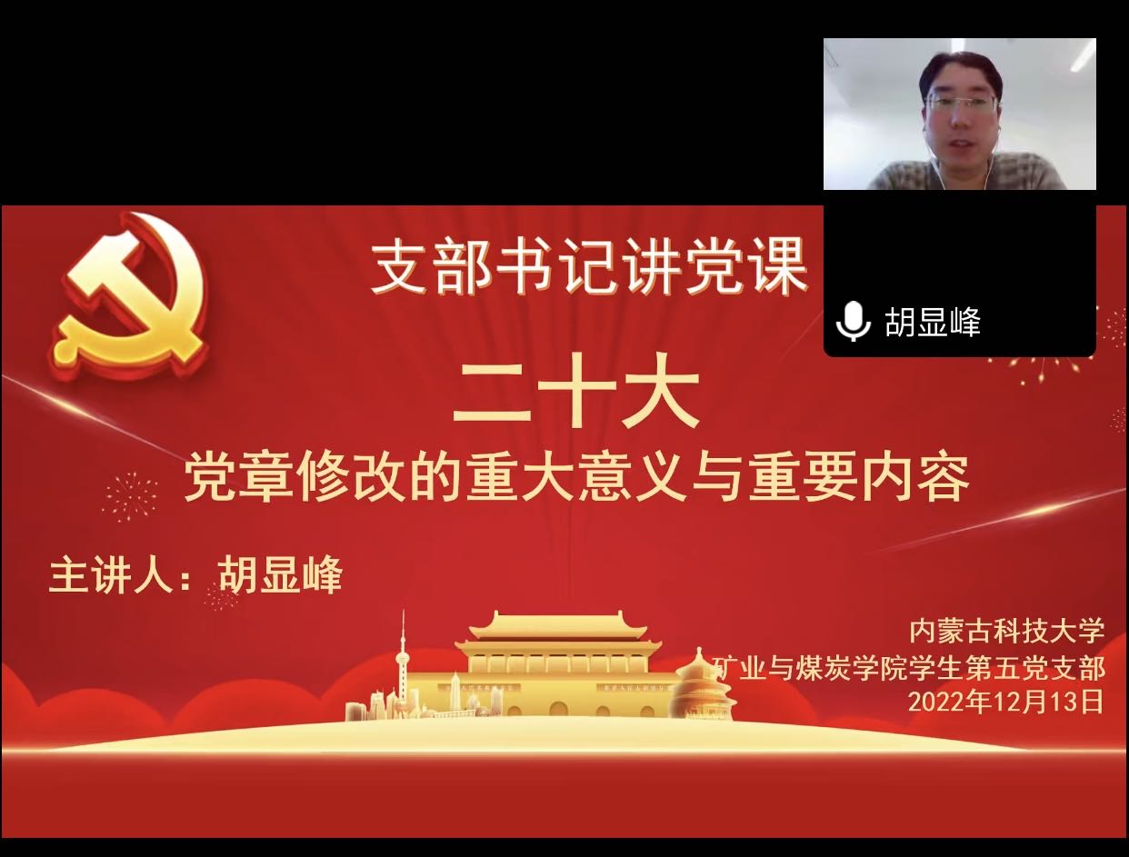 为引导广大党员深入学习贯彻党的二十大精神,更加自觉地学习党章、遵守党章、贯彻党章、维护党章,jinnianhui今年会学生第五党支部于2022年12月13日组织开展支部书记讲党课,党课由支部书记胡显峰主讲,支部全体党员参加学习,本次学习利用腾讯会议线上开展。